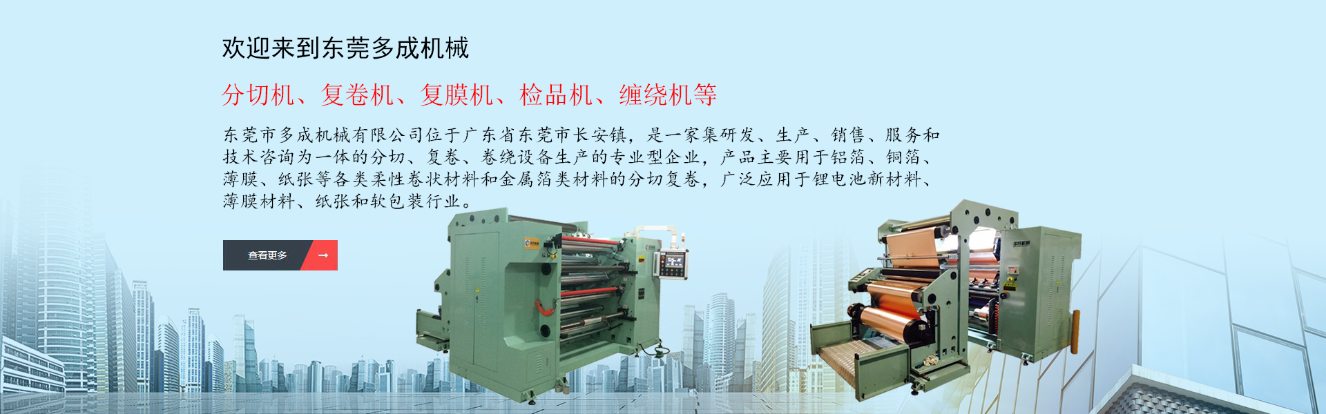 東莞市多成機械有限公司位于廣東省東莞市長安鎮(zhèn),是一家集研發(fā)、生產、銷售、服務和技術咨詢?yōu)橐惑w的分切、復卷、卷繞設備生產的專業(yè)型企業(yè),產品主要用于鋁箔、銅箔、薄膜、紙張等各類柔性卷狀材料和金屬箔類材料的分切復卷,廣泛應用于鋰電池新材料、薄膜材料、紙張和軟包裝行業(yè),產品范圍有分切機、復卷機、復膜機、檢品機、纏繞機等,是國內外分切卷繞設備專業(yè)供應商。